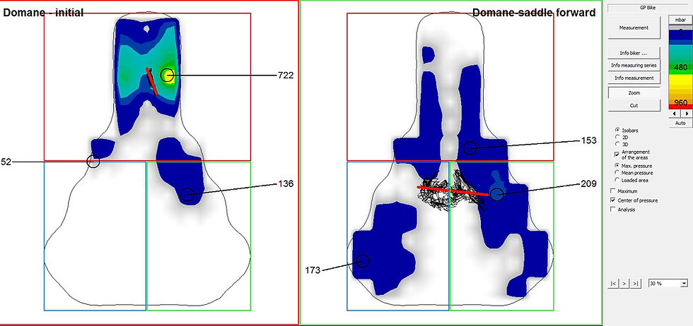 I spent some time with Royce at Velocity Cycling http://velocitysportscycling.com in Binfield this week having a bike, saddle and cleat fit. Turns out that the real-time pressure point analysis showed I'm sitting WAY too far forward on the saddle. We moved it forwards a whole 4cm - with dramatic effect. See the before and after images below: